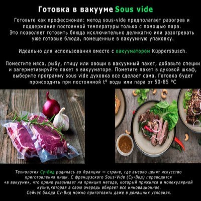 Компактный духовой шкаф с паром Kuppersbusch CBD 6550.0  Объем: 43 литраTFT-дисплей шириной 3,9" с текстовым и графическим полями14 режимов духового шкафа 8 специальных режимов 6 режимов приготовления на пару9 специальных режимов приготовления на пару Более 40 автоматических программ20 избранных программ для сохранения индивидуальных настроекЭлектронная система управления с сенсорными кнопкамиОтображение фактической температуры и рекомендуемойЭлектронный таймер (продолжительность программы, окончание, таймер обратного отсчета) с белыми индикаторамиСъемная дверца с полностью стеклянной внутренней поверхностьюЧетырехслойное остекление дверцыБыстрый разогревЭкономичный режимДемо-режимРежим ожиданияГалогенная подсветкаКонтактный дверной выключатель Катализатор Okoterm очищает воздух во время приготовления, таким образом стенки духового шкафа всегда абсолютно чистые! В отличие от энергоёмкой технологии пиролиза (разрушение частиц грязи путём дожигания) при температуре около 500°С, okotherm® не требует дополнительного времени и дополнительных затрат электроэнергии.Режимы работыВерхний и нижний нагревПодача тепла сверху и снизу обеспечивает равномерное приготовление продуктов, расположенных на одном уровне. Прекрасно подходит для выпечки пирожных и пирогов, например, изделий из дрожжевого теста, чизкейков и т. д.Обдув горячим воздухом с OkothermВентилятор распределяет тепло, генерируемое кольцевым нагревательным элементом, который расположен на задней стенке рабочей камеры. Обеспечиваемая таким образом одинаковая температура по всему объему рабочей камеры гарантирует равномерное приготовление блюд на всех уровнях направляющих, не ухудшая их вкус и запахВерхний и нижний нагрев с обдувом горячим воздухомТепло, генерируемое верхним и нижним нагревательными элементами, равномерно распределяется по объему рабочей камеры с помощью вентилятора. Прекрасно подходит для выпечки и жаренияРежим "пицца" с OkothermСочетание нижнего нагрева и обдува горячим воздухом оптимально подходит для приготовления изделий в виде хрустящей основы с мягкой начинкой. Идеально для пиццы, печенья или выпечки с начинкой из фруктов и паштетовНижний нагревБлагодаря теплу, генерируемому только нижним нагревательным элементом, данный режим прекрасно подходит для приготовления изделий с хрустящей основой или для получения более коричневой корочки снизу. Прекрасно подходит для приготовления очень мягких фруктовых пирогов и для легкого запекания тестовой основы пирогов перед приготовлениемВерхний нагревТепло, генерируемое верхним нагревательным элементом, прекрасно подходит для запекания и подрумянивания блюдECOРежим ECO позволяет уменьшить энергопотребление при приготовлении блюд. Для снижения потребления электроэнергии, духовой шкаф автоматически отключается за несколько минут до окончания приготовления блюда, используя тепло, остающееся в рабочей камере, для доведения блюда до готовностиИнтенсивный обдув горячим воздухом с OkothermВключенный верхний нагревательный элемент, помимо обдува горячим воздухом, используется для создания хрустящей корочки и подрумянивания блюда. Прекрасно подходит для приготовления запеченного картофеля, жарения или запеканияГриль + нижний нагревТепло от нижнего нагревательного элемента и расположенного свер